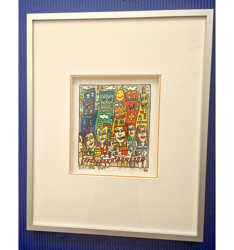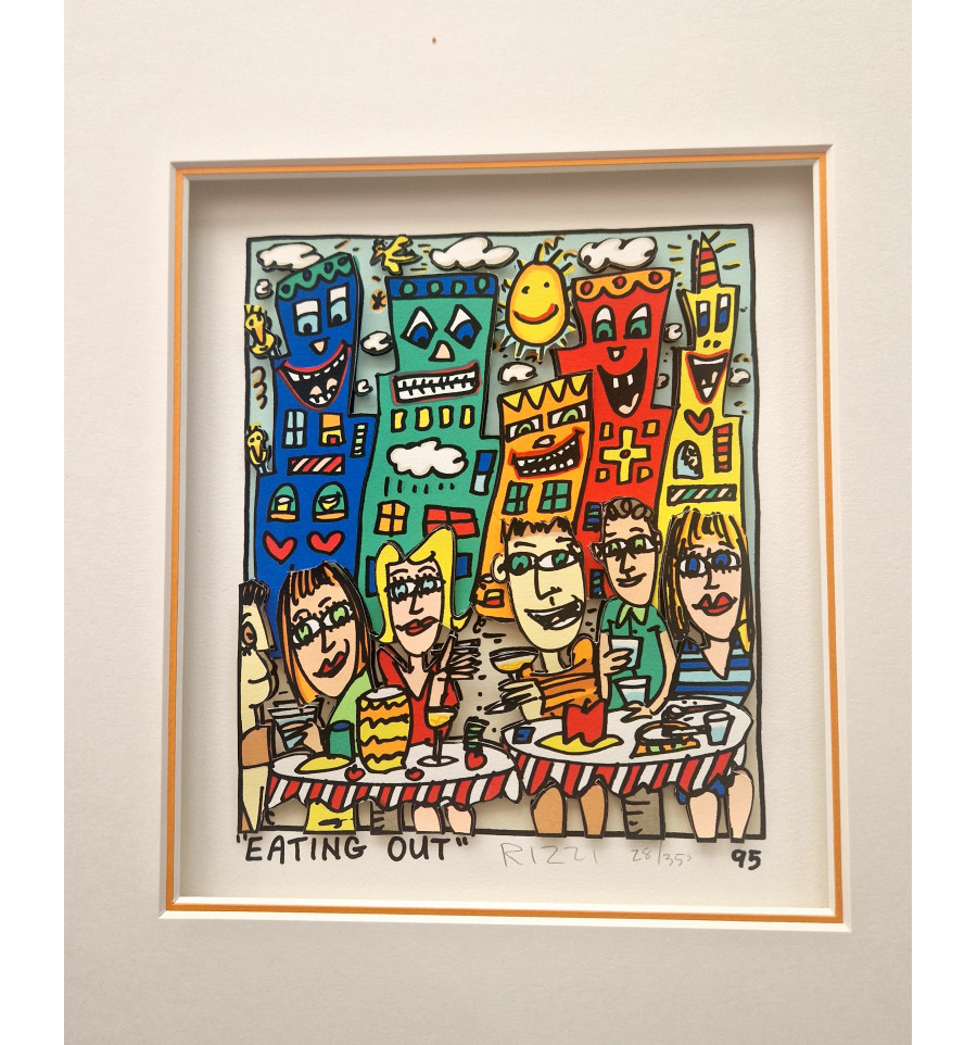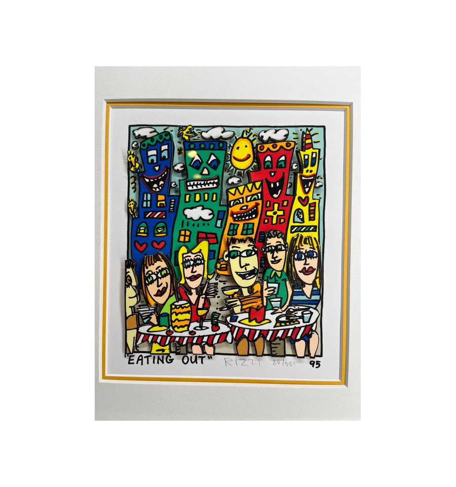 EATING OUT ist eine original 3D-Graphik des im Dezember 2011 verstorbenen Künstlers James Rizzi aus 1995. Diese limitierte 3D-Arbeit ist handsigniert und nummeriert. Die 3D-Graphik wird mit dem typischen Rizzi-Doppelpassepartout mit farbiger Innenkante und klassischer Alurahmung von Halbe geliefert, das im Preis bereits enthalten ist. Im Lieferumfang ist ein Echtheitszertifikat unserer Galerie beigefügt.