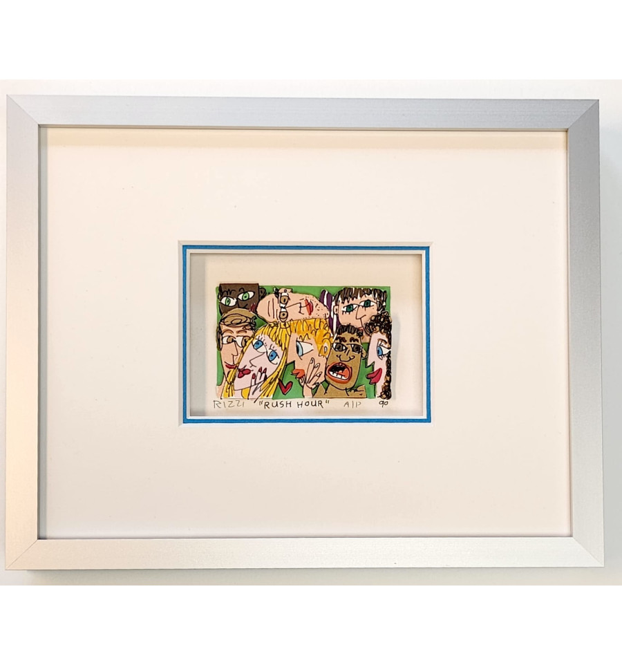 “RUSH HOUR " ist eine original 3D-Graphik des Künstlers James Rizzi. Diese limitierte 3D-Arbeit ist HANDSIGNIERT und von Hand nummeriert. Die 3D-Graphik wird mit dem typischen Rizzi-Doppelpassepartout mit farbiger Innenkante und Abstandsleiste im Format 20 x 24 cm und silbermatten ALU- Rahmen von Halbe geliefert.