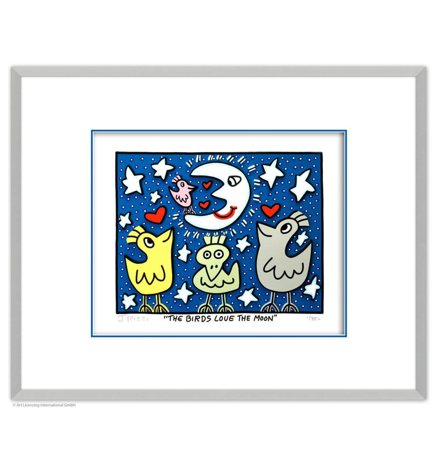 “THE BIRDS LOVE THE MOON“ ist eine original 3D-Graphik des Künstlers James Rizzi. Diese limitierte 3D-Arbeit ist im Druck signiert und von Hand nummeriert. Die 3D-Graphik wird von der Agentur aus dem typischen Rizzi-Doppelpassepartout mit farbiger Innenkante und Abstandsleiste sowie HALBE RAHMEN im Format 40 x 50 cm geliefert.Um die Echtheit des Werkes zu garantieren, befindet sich auf der Rückseite ein einzigartiges Hologramm. Zudem ist im Lieferumfang ein Echtheitszertifikat beigefügt.