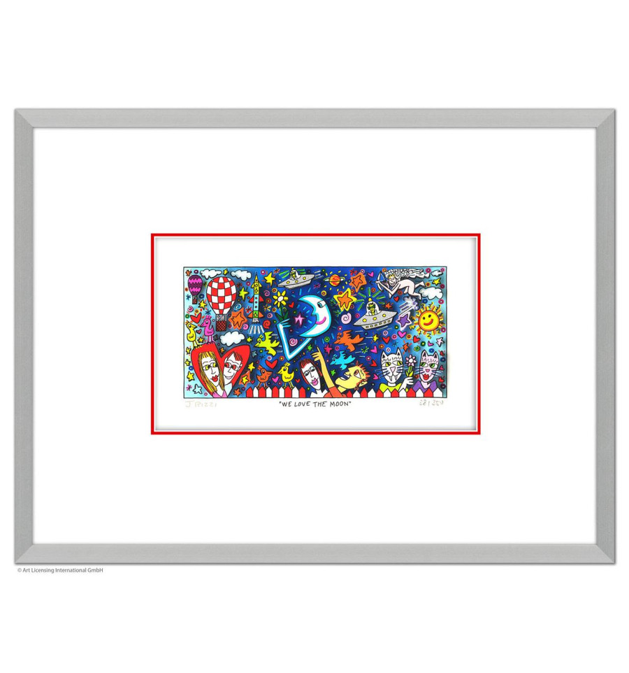 “We love the moon“ ist eine original 3D-Graphik des im Dezember 2011 verstorbenen Künstlers James Rizzi. Diese streng limitierte 3D-Arbeit ist im Druck signiert und von Hand nummeriert. Die 3D-Graphik wird von der Agentur aus dem typischen Rizzi-Doppelpassepartout mit farbiger Innenkante und Abstandsleiste im Format 30 x 40 cm. Um die Echtheit des Werkes zu garantieren, befindet sich auf der Rückseite ein einzigartiges Hologramm. Zudem ist im Lieferumfang ein Echtheitszertifikat beigefügt,