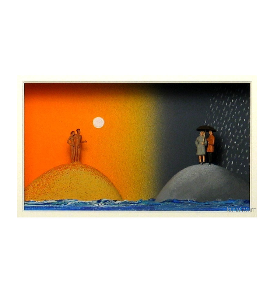 Einzigartige 3D Objektbox. Handgefertigtes Unikat, welches vom Künstler betitelt und signiert wurde. Inkl. verglaste Massivholz-Vitrinenrahmung.